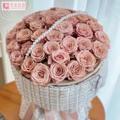 花材:卡布奇诺玫瑰36枝,珠链一条。 包装:小香风布艺花束包装。