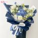 花材:蓝色绣球1枝,白玫瑰6枝,天鹅绒1枝,白色洋桔梗,水仙百合,白色蓝星花,洋甘菊搭配 包装:白色雪梨纸内衬,蓝色欧雅纸扇形包装,白色蝴蝶结装饰。