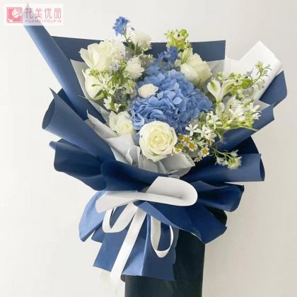花材:蓝色绣球1枝,白玫瑰6枝,天鹅绒1枝,白色洋桔梗,水仙百合,白色蓝星花,洋甘菊搭配 包装:白色