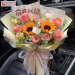花材:向日葵2枝,朱小姐玫瑰8枝,香槟色洋桔梗,白色洋桔梗,洋甘菊,尤加利叶搭配。 包装:文字枝内衬