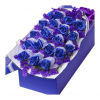 [材料]:蓝色妖姬19枝,紫色勿忘我搭配。 [包装]:白色纱网包裹花头,长形礼盒精美包装,紫色蝴蝶