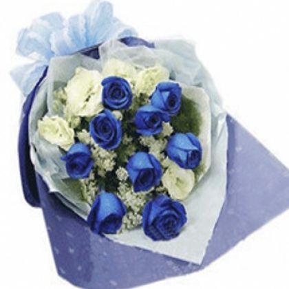 [材料]:9枝蓝色妖姬,白色洋桔梗和满天星搭配 [包装]:白色棉纸内衬,浅蓝色皱纹纸单面精美包装