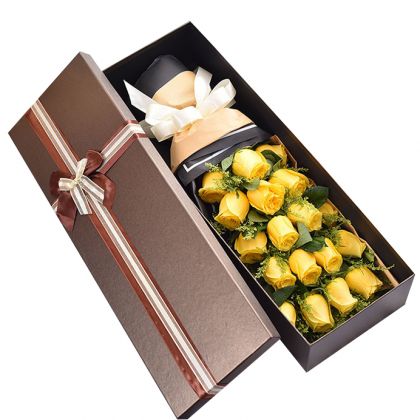 材料:19枝黄玫瑰,黄英搭配。 包装:香槟色咖啡色平面纸制作,长形礼盒精美包装(礼盒颜色随机)。