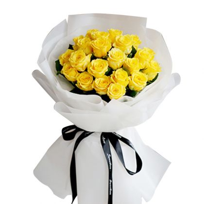 材料:精选黄玫瑰21枝。 包装:乳白色雾面纸精美圆形包装,黑色丝带束扎。