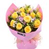 材料:11枝黄玫瑰,黄英 相思梅,栀子叶搭配。 包装:粉色韩素纸圆形精美包装,拉菲草束扎。