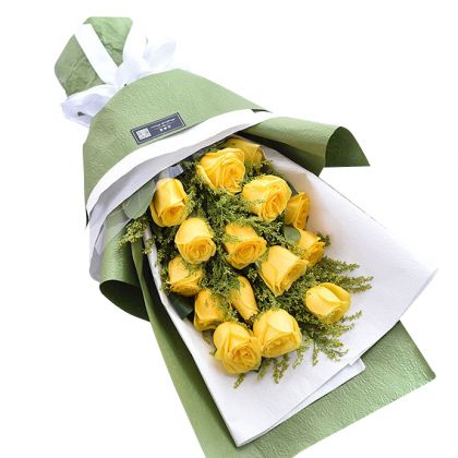 材料:15枝黄玫瑰,黄英搭配。 包装:白色手揉纸内衬,绿色手揉纸精美包装,白色缎带蝴蝶结。