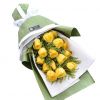 材料:15枝黄玫瑰,黄英搭配。 包装:白色手揉纸内衬,绿色手揉纸精美包装,白色缎带蝴蝶结。