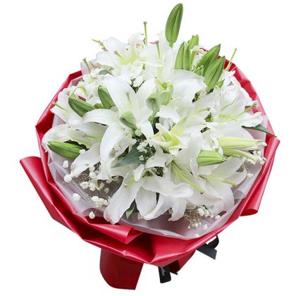 [材料]:8枝多头白色香水百合,满天星点缀。 [包装]:白色雾面纸内衬,红色雾面纸圆形精美包装,黑