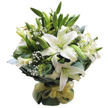 [材料]:12枝白色多头香水百合,黄英,满天星点缀 [包装]:玻璃纸内衬,手揉纸托底圆形包装,丝带