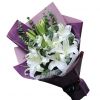 [材料]:6枝多头香水白百合,尤加利搭配。 [包装]:深紫色双色欧雅单面包装,黑色丝带蝴蝶结束扎。