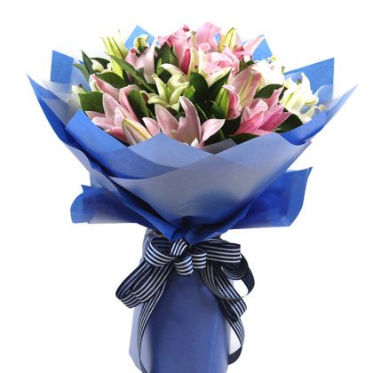 [材料]:8枝多头香水百合白色粉色混搭,绿叶搭配。 [包装]:蓝色皱纹纸圆形精美包装,条纹丝带花结