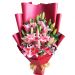 [材料]:11枝粉色香水百合,黄英搭配。 [包装]:红色莫迪纸单面扇形包装,拉菲草束扎。