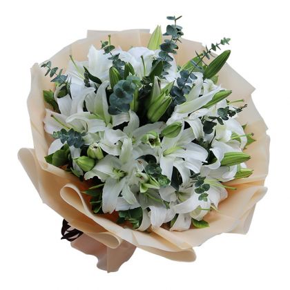 [材料]:11枝多头白色百合,尤加利搭配。 [包装]:香槟色雾面纸圆形精美包装,黑色丝带束扎。