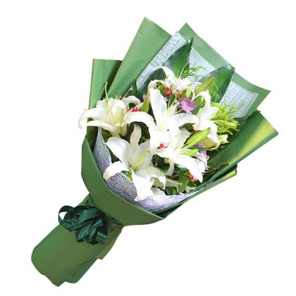 [材料]:12朵白色香水百合,红豆,黄英搭配。 [包装]:麻丝网内衬,绿色卡纸精美包装,绿色丝带装