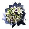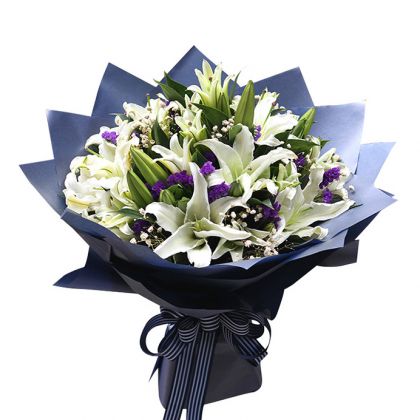 [材料]:12枝多头白色香水百合,勿忘我,满天星搭配。 [包装]:深蓝色欧雅纸圆形精美包装,条纹缎