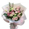 [材料]:11枝粉雪山玫瑰,粉色、绿洋桔梗,尤加利,绿叶搭配。 [包装]:粉色雾面纸单面精美包装,