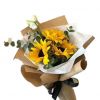 [材料]:3枝精选向日葵,尤加利,洋桔梗搭配。 [包装]:白色雪梨纸内衬,牛皮纸外包,黑色字母缎带