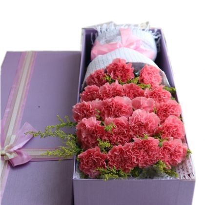 [材料]:19枝粉色康乃馨,黄英点缀 [包装]:精美套装礼盒包装(礼盒颜色随机)