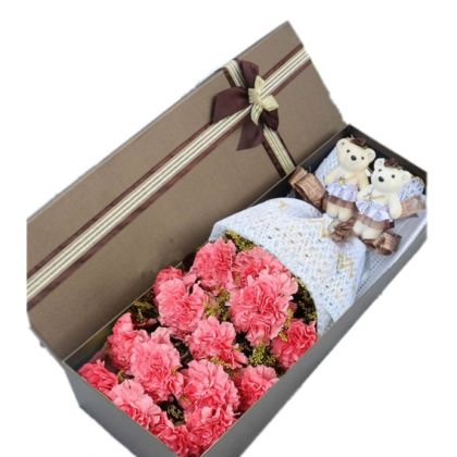[材料]:16枝粉色康乃馨+2卡通,黄英搭配 [包装]:W线网精美包装,精美套装礼盒(颜色随机)