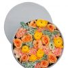 [材料]:8枝香槟玫瑰,8枝粉边香槟康乃馨,6枝毛茛,叶上花若干点缀。 [包装]:圆形精品绒布饰品