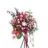 [材料]:紫红玫瑰共30枝,酒红色桔梗,红掌5片,圆叶尤加利叶,龟背叶,红桑叶,千代兰。 [包装]: