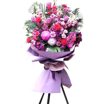 [材料]:紫玫瑰,牡丹菊或紫色大丽花,康乃馨,紫色相思梅,紫罗兰,多头康,多头玫瑰,龟背叶,散尾叶。