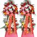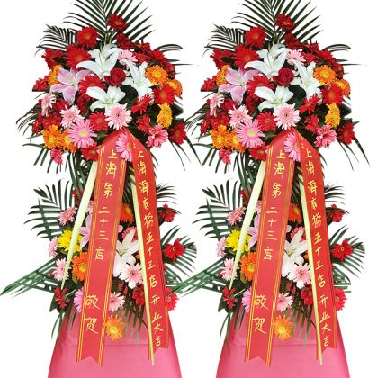 [材料]:百合,扶郎,玫瑰,康乃馨,海桐叶,散尾叶。 [包装]:竹子三脚架,大红色皱纹纸包装,精美双层制作。 [备注]:全国各城市分店有货,预定花篮请提前1-2天较好。