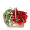 [材料]:绿色绣球,精选大玫瑰18枝,火龙珠,小叶尤加利,千代兰。 [包装]:台式草编花篮精美制