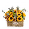 [材料]:向日葵10枝,绿色雏菊,橙色太阳菊,尤加利叶搭配。 [包装]:台式草编花篮精美制作。
