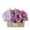 [材料]:粉紫色绣球,紫玫瑰18枝,深紫色洋桔梗丰满,小叶尤加利,银叶菊搭配。 [包装]:台式草