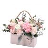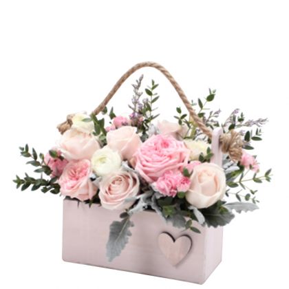 [材料]:戴安娜玫瑰,粉色雪山玫瑰,白色洋牡丹,小叶尤加利,情人草,银叶菊。 [包装]:木盒式手提