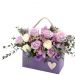 [材料]:紫玫瑰,雪山白玫瑰,康乃馨,小叶尤加利,刺琴,白色纽扣菊。 [包装]:木盒式手提花篮精