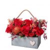 [材料]:优选红玫瑰,针垫1枝,凤梨1棵,火龙珠,千代兰,天竺葵叶搭配。 [包装]:木盒式手提花