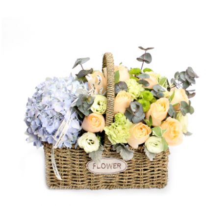 [材料]:蓝色绣球,香槟玫瑰18枝,绿色康乃馨,尤加利叶,绿色雏菊搭配。 [包装]:台式草编花篮