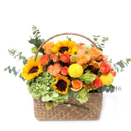 [材料]:精选向日葵5枝,香槟玫瑰,绿色绣球,橙色多头玫瑰,黄金球,尤加利叶搭配。 [包装]:台