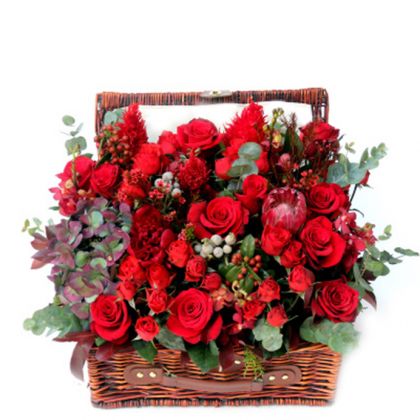 [材料]:紫绿色绣球,大红玫瑰18枝,红色多头小玫瑰丰满,红色凤尾2枝,尤加利,冬青果,红色澳梅搭