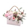 [材料]:粉色绣球,粉色雪山玫瑰,荔枝玫瑰,小叶尤加利,澳梅,鼠尾u,银叶菊搭配。 [包装]:木