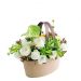 [材料]:白色洋桔梗,雪山玫瑰,绿掌,火龙珠,黄金球,叶上金搭配。 [包装]:牛皮纸盒式手提花篮