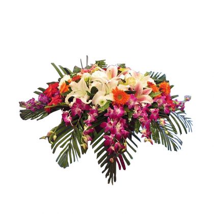 [材料]:白色百合,粉百合,橙色扶郎,洋兰。 [包装]:讲台专用花泥底座,散尾叶,栀子叶等搭配。