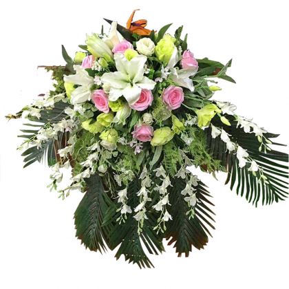 [材料]:多头粉百合2枝,粉雪山玫瑰10枝,白兰10枝,天堂鸟1枝,绿色洋桔梗若干。 [包装]:讲