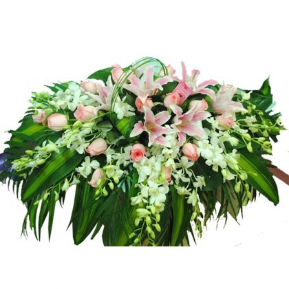 [材料]:多头粉百合2枝,戴安娜玫瑰16枝,白兰12枝。 [包装]:讲台专用花泥底座,散尾叶,巴西