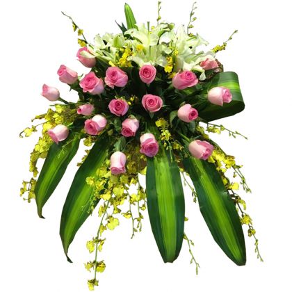 [材料]:多头白色香水百合3枝,苏醒玫瑰20枝,跳舞兰10枝。 [包装]:讲台专用花泥底座,巴西叶