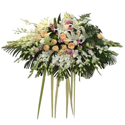 [材料]:白色洋兰18枝,香槟玫瑰18枝,白色香水百合,粉色洋桔梗。 [包装]:讲台专用花泥底座