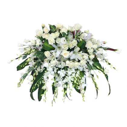 [材料]:白百合,白玫瑰,白色洋桔梗,白色洋兰。 [包装]:讲台专用花泥底座,巴西叶,栀子叶等搭