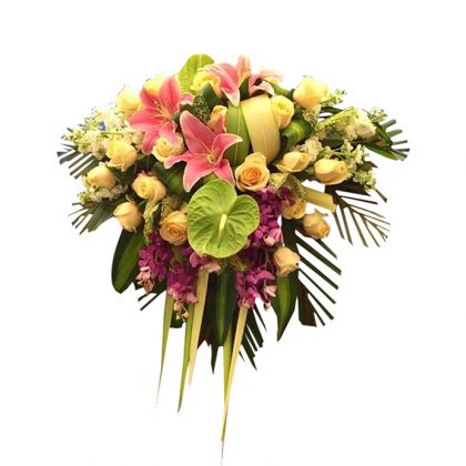 [材料]:粉百合,香槟玫瑰,紫色千代兰6枝,白色紫罗兰6枝,绿掌2片。 [包装]:讲台专用花泥底