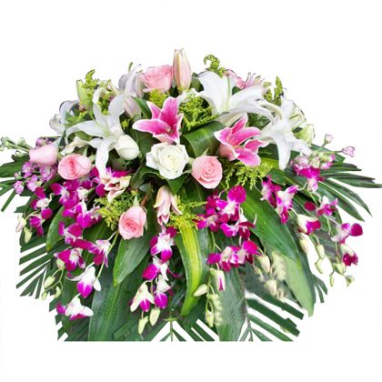 [材料]:粉百合,白百合,戴安娜玫瑰,白玫瑰,洋兰10枝。 [包装]:讲台专用花泥底座,散尾叶,