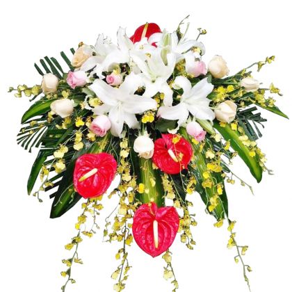 [材料]:白百合,香槟玫瑰 苏醒玫瑰共16枝,红掌4片,跳舞兰12枝。 [包装]:讲台专用花泥底