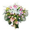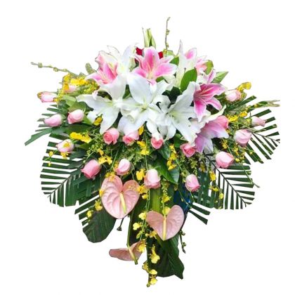 [材料]:白百合,粉百合,苏醒玫瑰20枝,粉掌3片,跳舞兰12枝。 [包装]:讲台专用花泥底座,