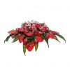 [材料]:粉百合,苏醒玫瑰20枝,大红掌10片。 [包装]:讲台专用花泥底座,栀子叶,巴西叶,满