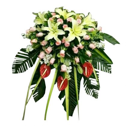 [材料]:大红掌3片、黄天霸百合、白紫罗兰,戴安娜玫瑰。 [包装]:讲台专用花泥底座,散尾叶,巴